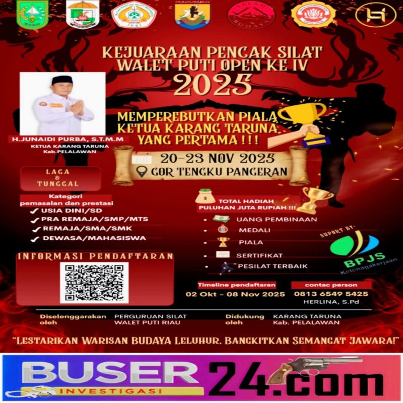 Ajang bergengsi pencak silat kembali digelar! Perguruan Silat Walet Puti Riau bersama Karang Taruna Kabupaten Pelalawan siap menyelenggarakan Kejuaraan Pencak Silat Walet Puti Open Ke-IV Tahun 2025, yang akan berlangsung pada 20–23 November 2025 di GOR Tengku Pangeran, Kabupaten Pelalawan.