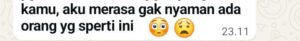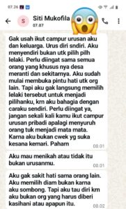 “Gak usah ikut campur urusan aku dan keluarga.Urus diri sndiri. Aku menyendiri bukan utk pilih pilh lelaki. Perlu diingat sama semua orang yang khusus nya desa meranti dan sekitarnya. Aku sudah mulai membuka pintu hati utk org lain. Tapi aku gak langsung memilih lelaki tersebut untuk menjadi pilihanku, krn aku bahagia dengan caraku sendiri. Perlu diingat ya, jangan sekali kali kamu ikut campur urusan pribadi apalagi menyuruh orang tuk menjadi mata mata. Karna aku bukan cwek yg suka kesana kemari. Paham”