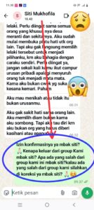 “Izin konfirmasinya ya mbak siti? 🙏🏻Kenapa keluar dari group Kami mbak siti? Apa ada yang salah dari group kami ini mbak siti?kalau ada yang salah dari group kami silahkan di koreksi ya mbak siti?”🙏🏻☺️